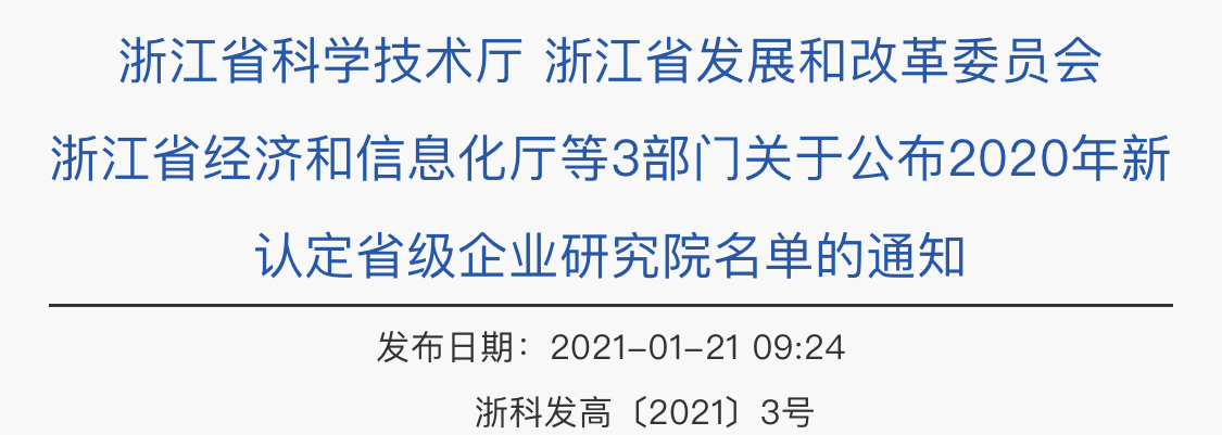 日前,浙江省科技廳、浙江省發展和改革委員會、浙江省經濟和信息化廳三部門聯合下發《關于公布2020年新認定省級企業研究院名單的通知》(浙科發高〔2021〕3號),“浙江省思進智能冷鐓成形裝備研究院”被認定為省級企業研究院。